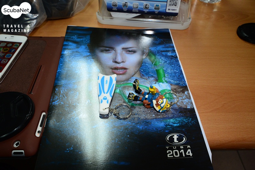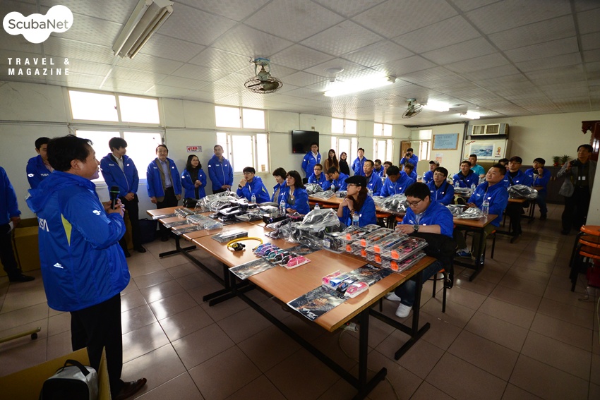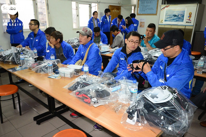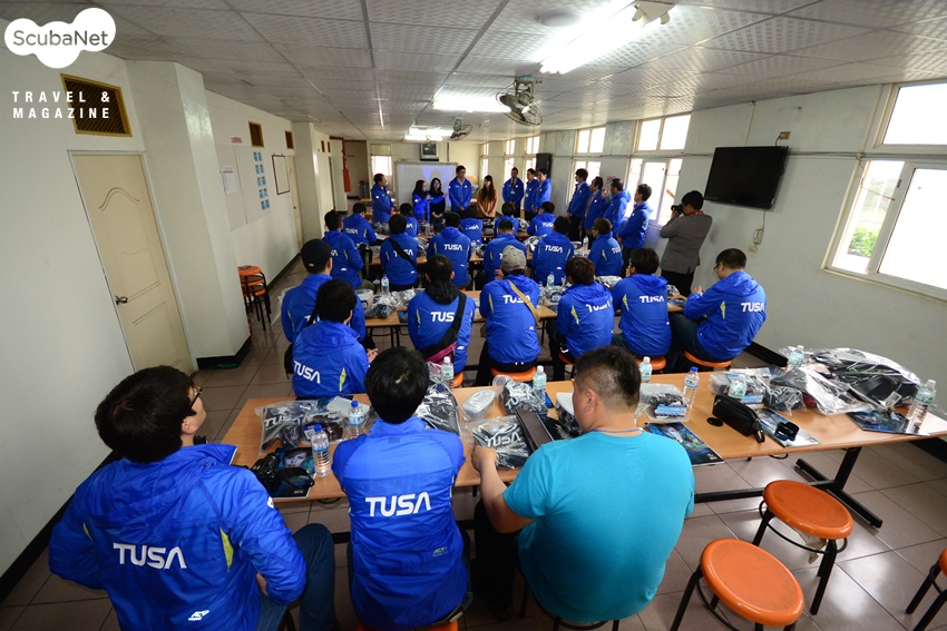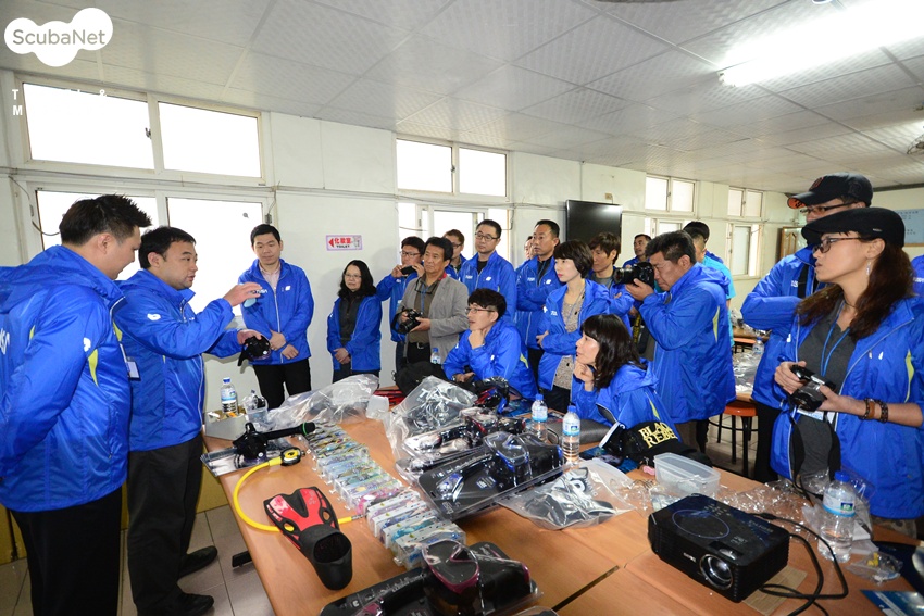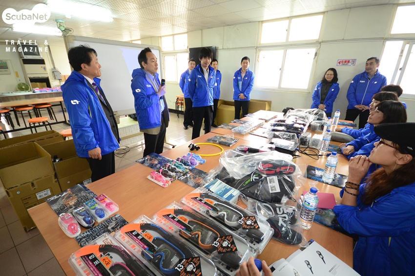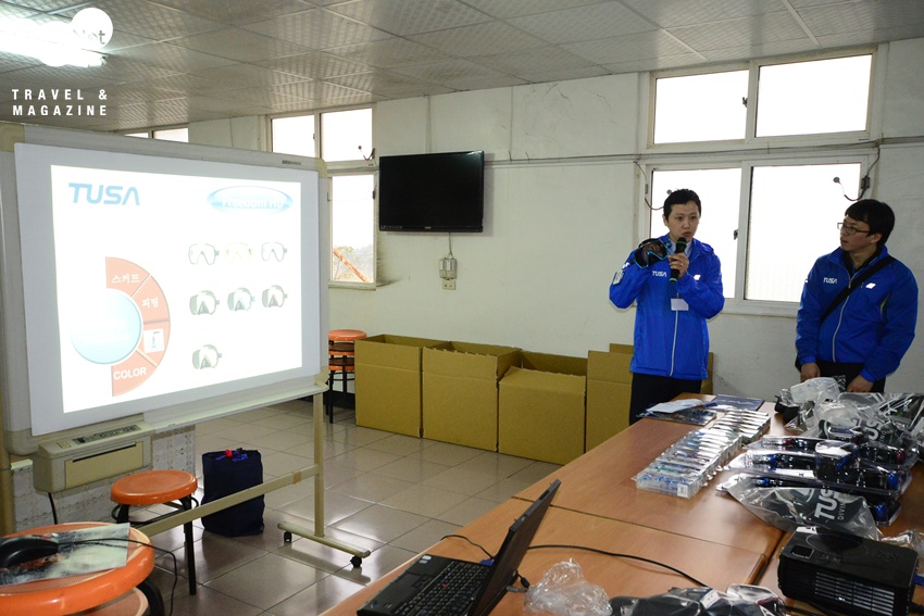우정사/오션챌린져의 직원들이 TABATA 회사의 연혁 그리고 타이완 공장에 대해 설명하고, TUSA의 2014년 신제품 소개 그리고 View, Reef Tourer 등의 브랜드와 TUSA 서페이스 스포츠 제품들에 대한 안내가 있었습니다.이미 2014년 KUSPO 쇼를 통해서 소개된 내용들이기는 했지만 참가자들은 관심을 갖고 경청하였으며, 주최측에서는 답례로 참가자들에게 전원 신제품 마스크 1개와 귀여운 열쇠고리 등을 기념품으로 제공해주었습니다.