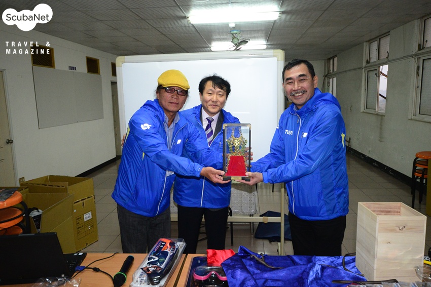 한편 우정사/오션챌린져에서는 Tabata Taiwan의 ** 사장에게 특별히 준비한 선물을 제공하였는데 신라금관 모형이었습니다. 참가자들 중에서 가장 연장자인 인천 그린피스의 강정훈 대표가 증정식을 가졌습니다.