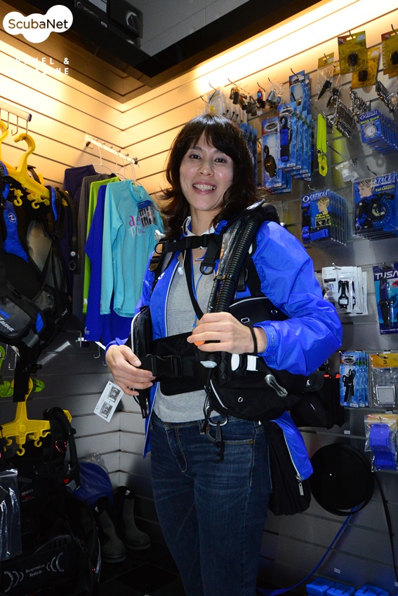 BC를 착용해보며 스쿠버 다이빙 장비와 교육에도 관심을 표하는 수영복나라의 김형신 대표