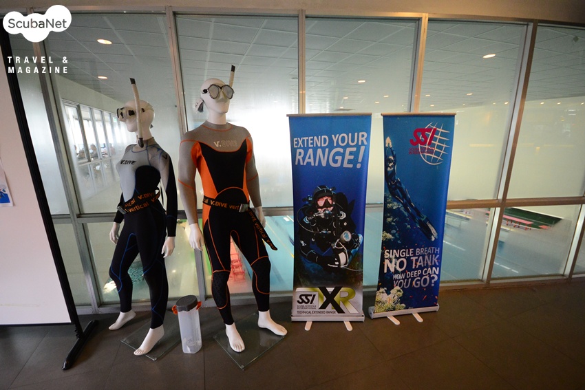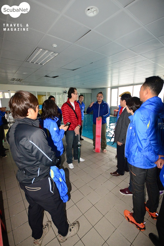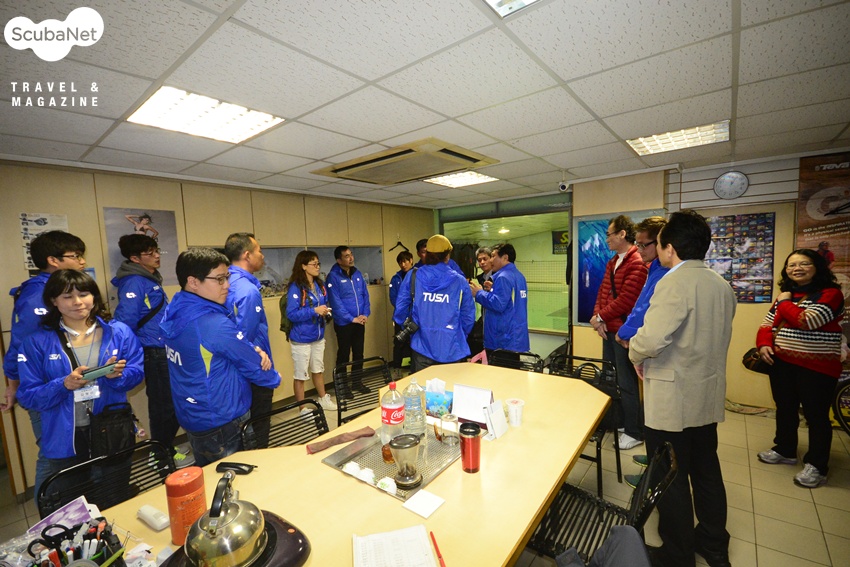 타이페이에는 스쿠버 다이빙풀이 2개 있는데 그중에 가장 오래된 것이 15년의 역사를 가진 개인소유의 풀인 태평양잠수이며, 3년전에 생긴 것이 바로 이 난강스포츠센터에 수영장과 함께 있는 다이빙풀입니다. 시내 스포츠센터에 생긴 다이빙풀이기에 여러가지 편의시설들이 함께 있으면서도 다이빙풀 이용자들이 별도의 탈의실과 샤워실을 이용할 수 있는 구조라 많은 다이버들이 이용하고 있다고 합니다. 다이빙전문점 대표들은 다이빙풀의 운영과 이용객, 비용에 관심이 있었고, 수영용품점 대표들은 수영동호인들이 선호하는 수영복과 고글에 관심을 보였습니다.