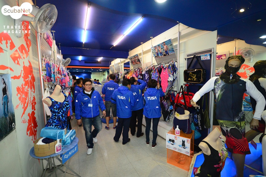 NILE이라는 브랜드의 수영전문점을 둘러보고 있는 참가자들