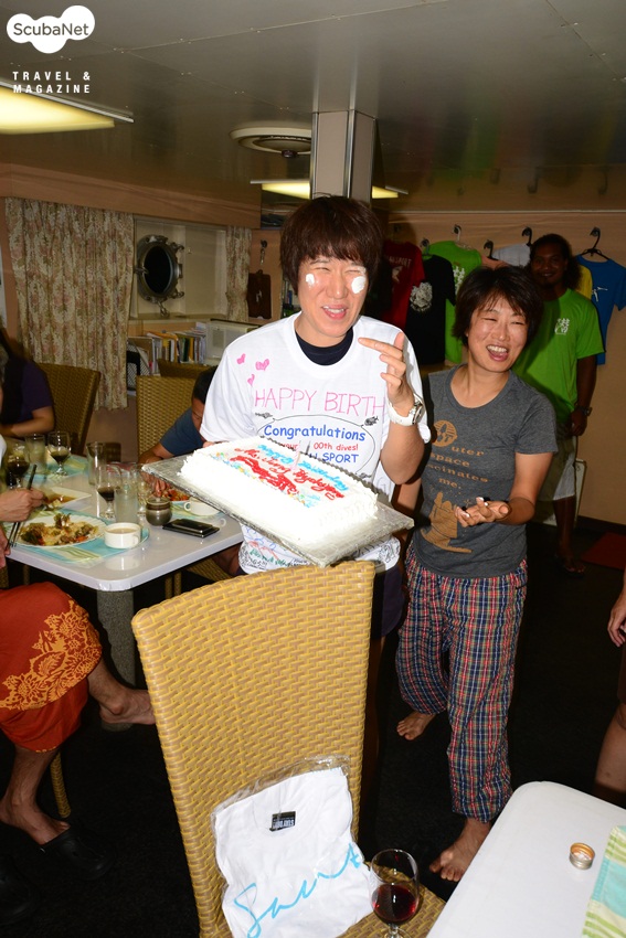 선상에서 생일을 맞아 케익과 선물을 받은 보라카이 씨월드 리조트의 정혜경(소피아) 강사