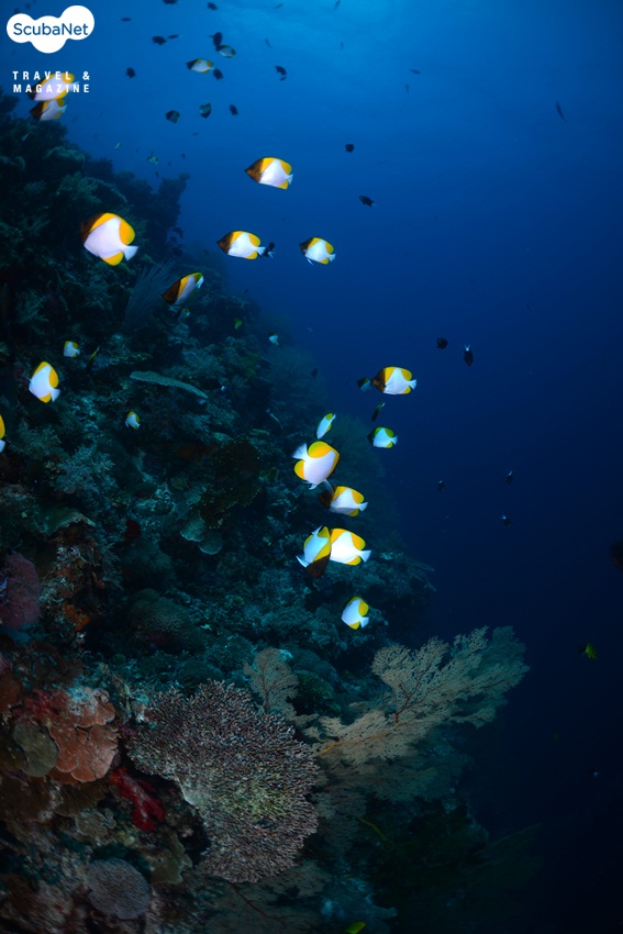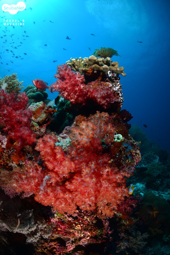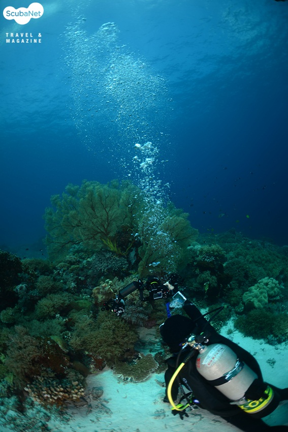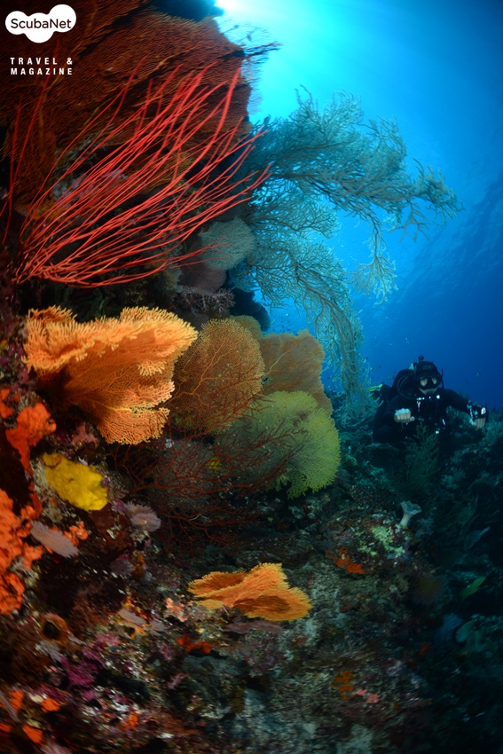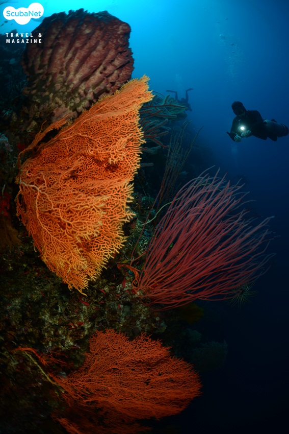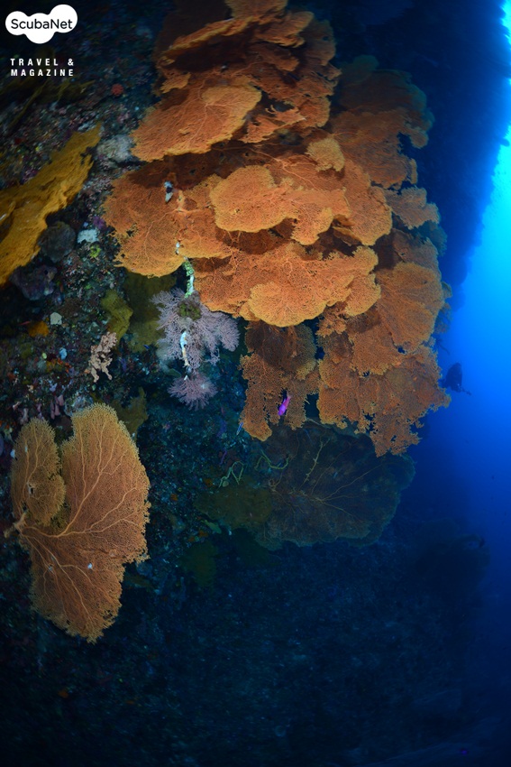 뭐니뭐니 해도 투바타하의 백미는 수심의 심저를 가리지 않고 울창하게 피어있는 부채산호들과 엄청나게 큰 항아리해면들입니다. 라이팅을 밝히면 숨어있던 화려한 색상을 뽐내는 산호들은 연출없이도 멋진 광각사진을 찍을 수 있게 해주었습니다.