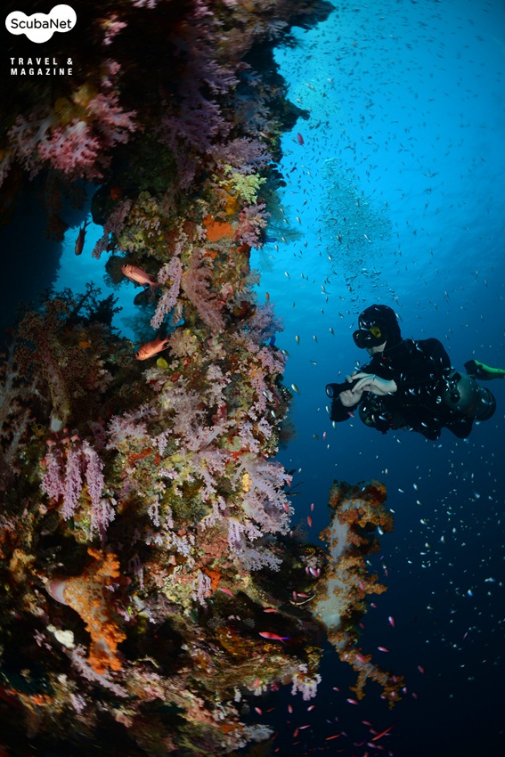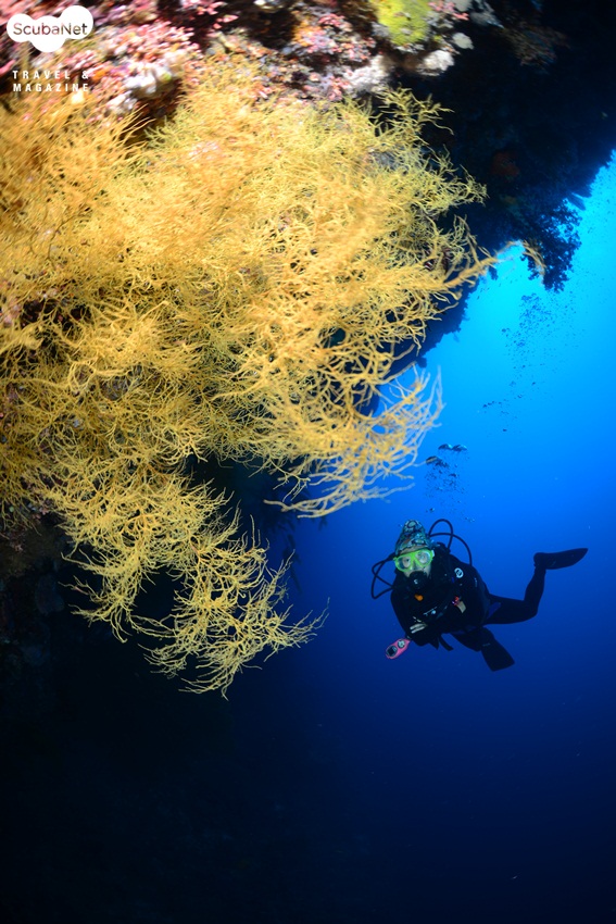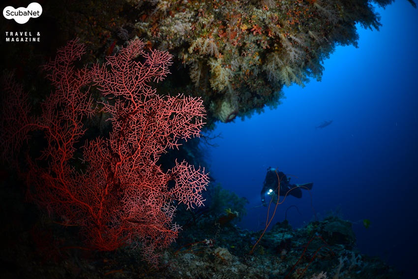 오버행의 붉은 산호와 코발트 빛 불색. 다이버 뒤로 대형 참치가 지나가고 있다. 모델/서동균