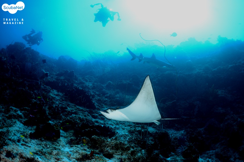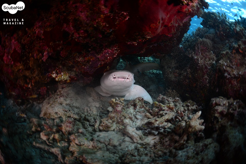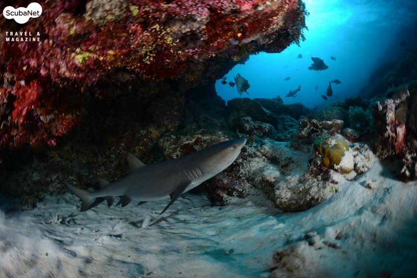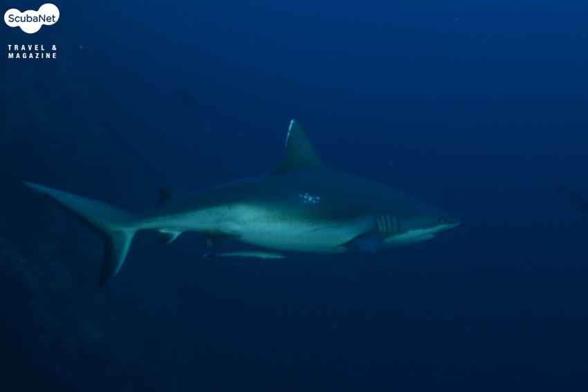 거센 조류를 타고 맴돌고 있는 불샤크(황소상어), 절벽을 따라 순항하는 그레이 리이프상어와 화이트팁 상어, 모래바닥이나 오버행 아래에서 쉬고 있는 화이트팁 상어와 너스 상어 그리고 이글레이까지 볼 수 있었고, 줄무늬의 무시무시한 타이거 상어도 목격되었습니다.