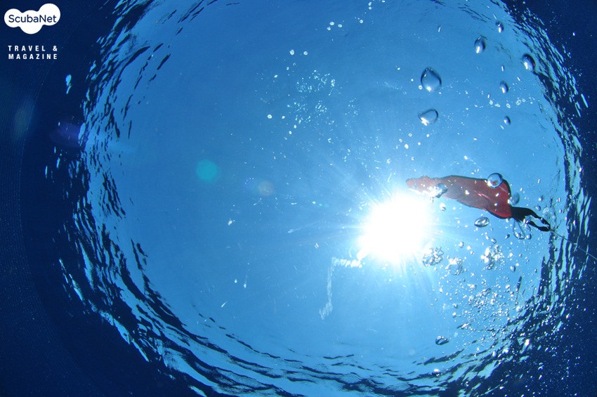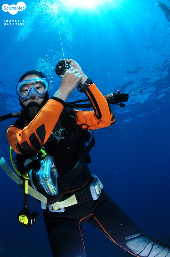 SMB에 매달려 안전정지 중인 다이버