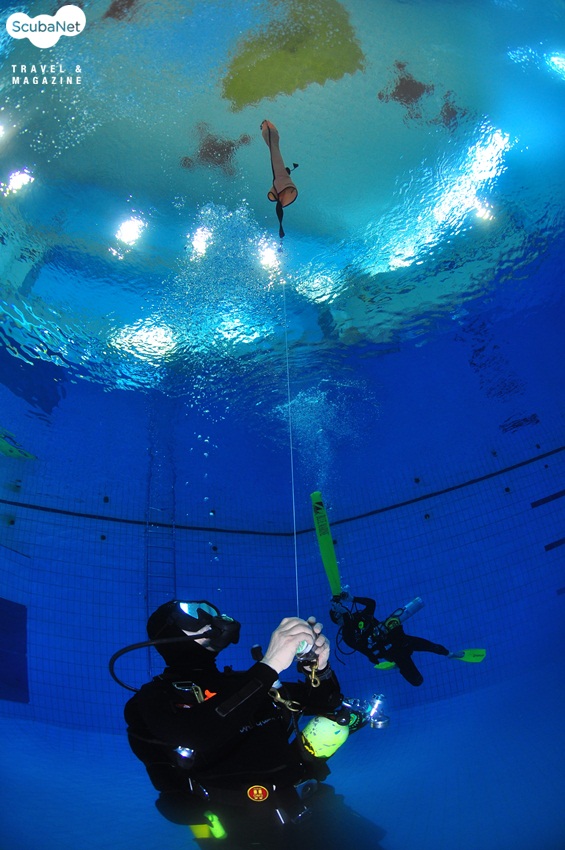 수영장에서 SMB 사용을 연습하는 다이버