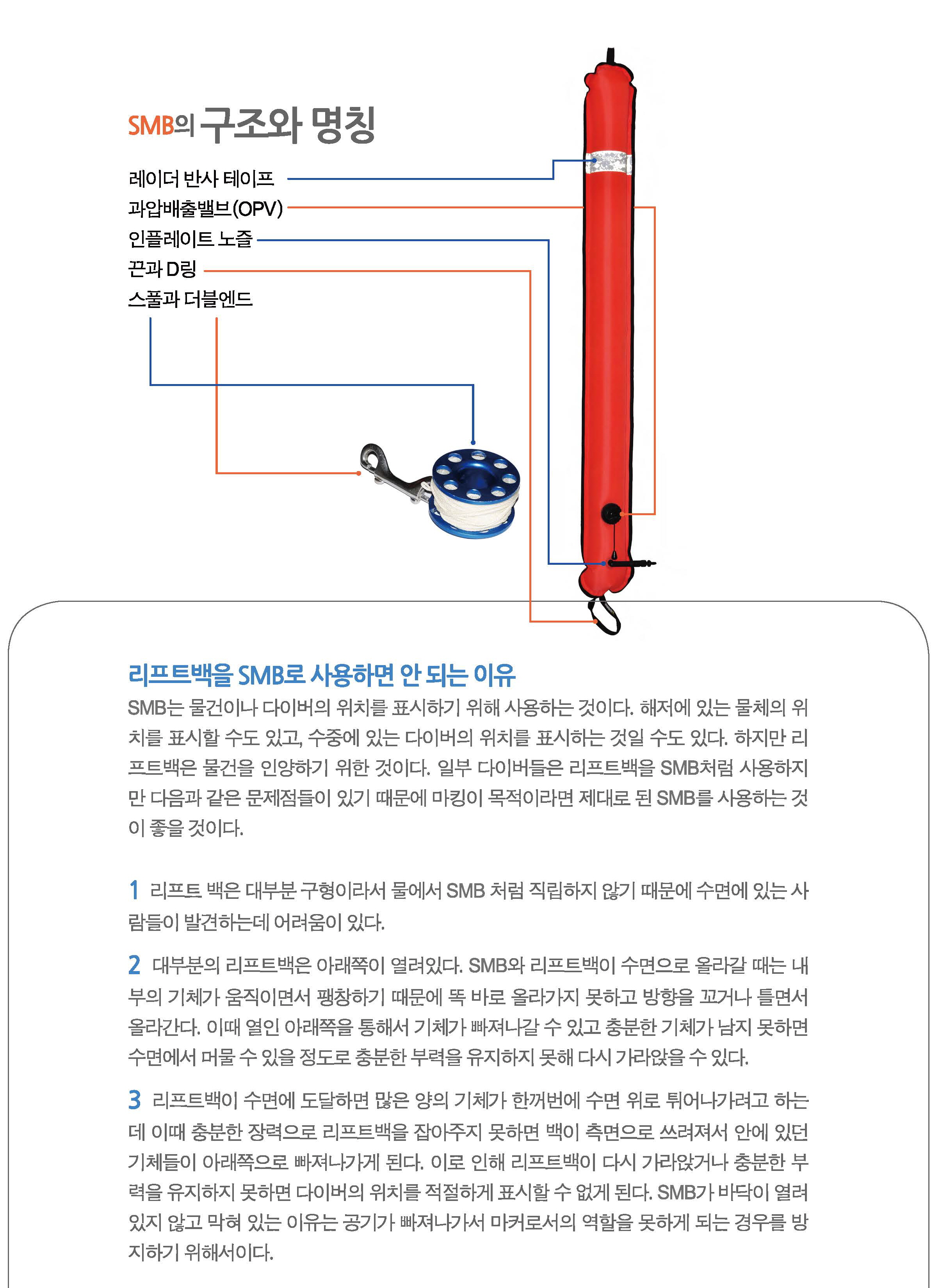 이렇듯 SMB는 사용 목적에 맞게 다른 특징과 기능을 가지고 있다. 따라서 다이버들은 단순히 수면에서 주목을 끌기 위한 목적으로 사용할 것인지,