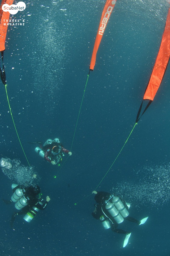 테크니컬 다이버들이 감압을 하면서 SMB를 사용하는 모습