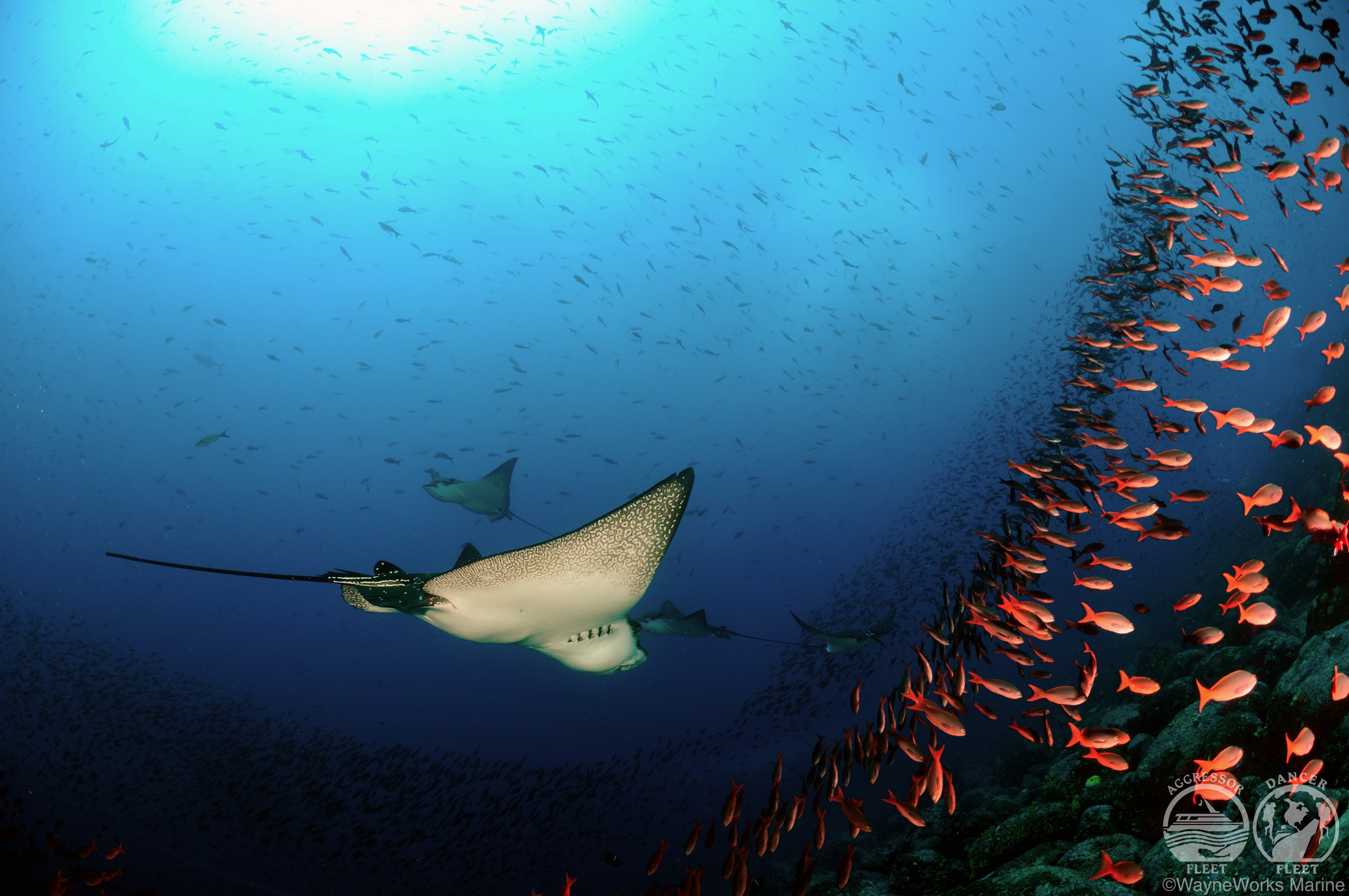 갈라파고스는 스쿠버 다이버들에게는 최고의 여행지이면서도, 다윈의 진화론의 산실로 육지거북, 육지이구아나, 바다이구아나, 핀치새, 갈라파고스 펭귄 등의 생물학적 가치를 지닌 동물들을 직접 보고, 설명을 들을 수 있으며, 화산섬의 진화에 대해서도 직접 볼 수 있습니다. 다이빙으로는 헴머헤드 상어, 고래상어, 갈라파고스 상어, 만타레이, 개복치, 이글레이, 스팅레이, 바다사자, 수중에서 먹이를 먹는 바다이구아나, 돌고래, 바다거북 등 다이버들이 보고 싶어하는 모든 것들을 볼 수 있습니다. 잭피쉬와 바라쿠다, 그루퍼, 혹돔 등 다른 곳에서 보기 힘든 어류들은 너무 흔한 어종이 되어버립니다. 이 모든 것은 한번에 볼 수 있는 갈라파고스는 직접 경험하지 않고서는 최후의 다이빙 여행지라는 말을 이해할 수 없을 것입니다.