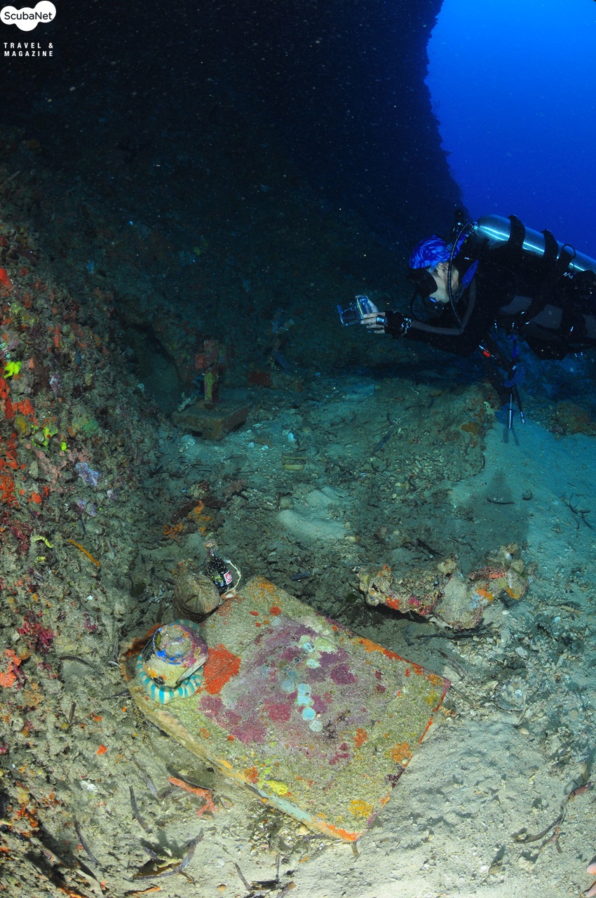 마리곤돈 캐이브 입구 오른쪽의 추모비들을 촬영하는 다이버