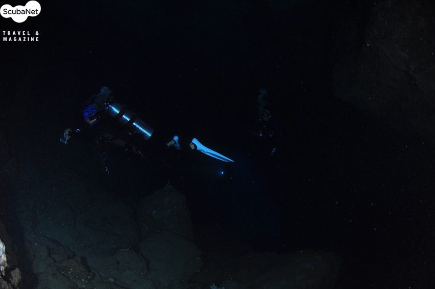 캐이브 입구 근처 천정에 씨팬들과 형광물고기를볼 수 있다