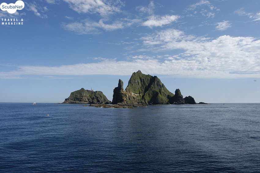 관음도 뒤쪽으로 보이는 울릉도. 오른쪽 끝에 삼선암이 보인다.