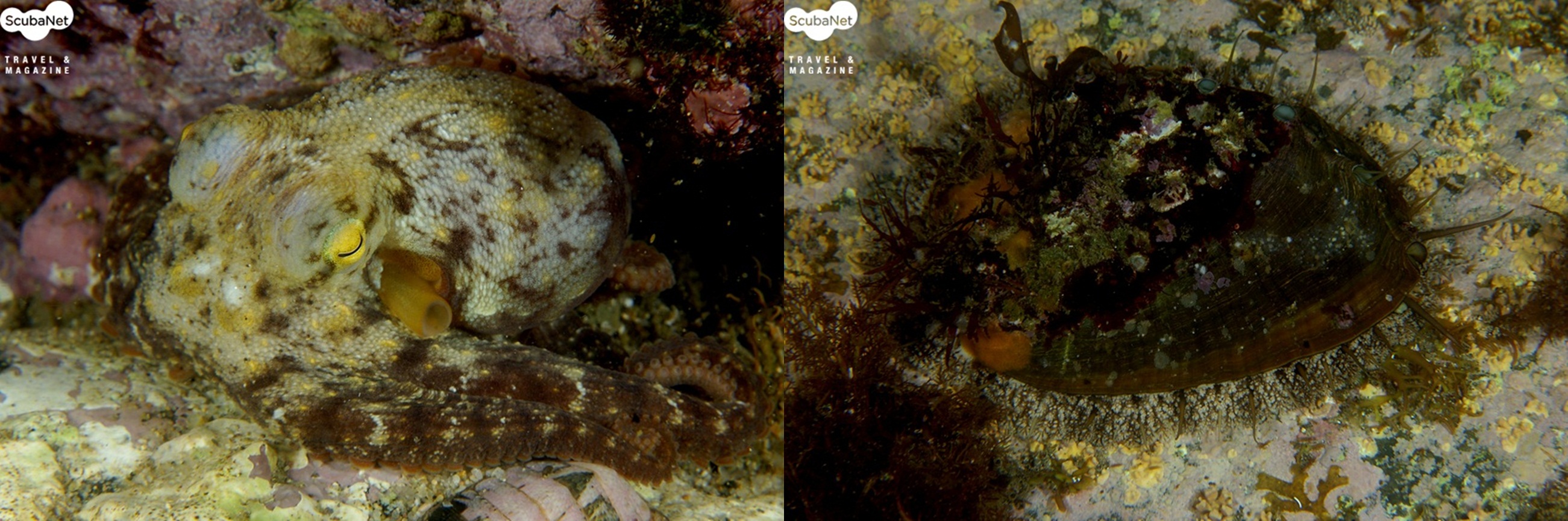 야간 다이빙에서 만난 어린 문어, 활 발 한 먹이활동을 펼치는 전복