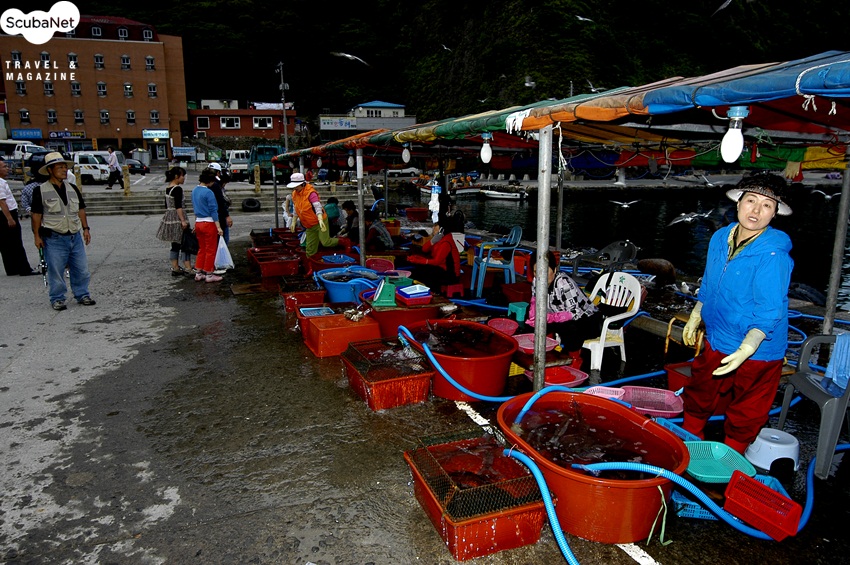 도동항 난전에서는 싱싱한 오징어와 해산물을 맛볼 수 있다