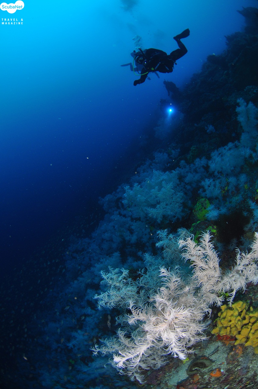 쌍정초의 수중 봉우리 사이를이동하는 다이버들
