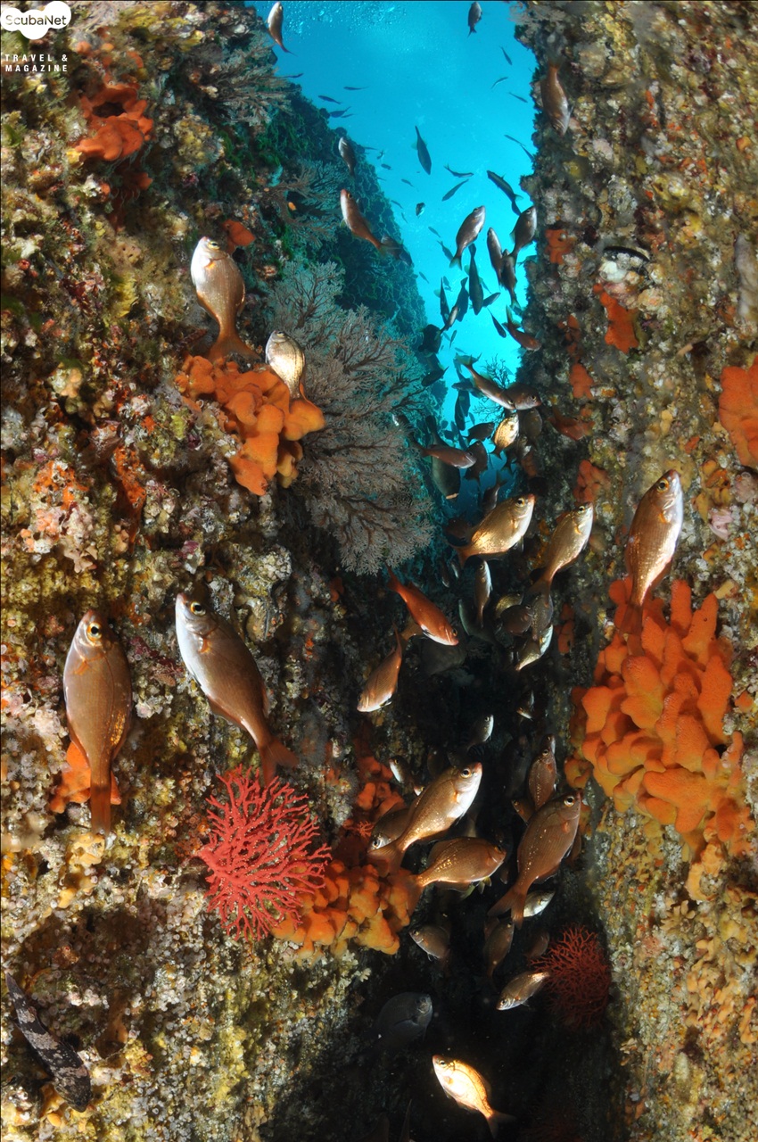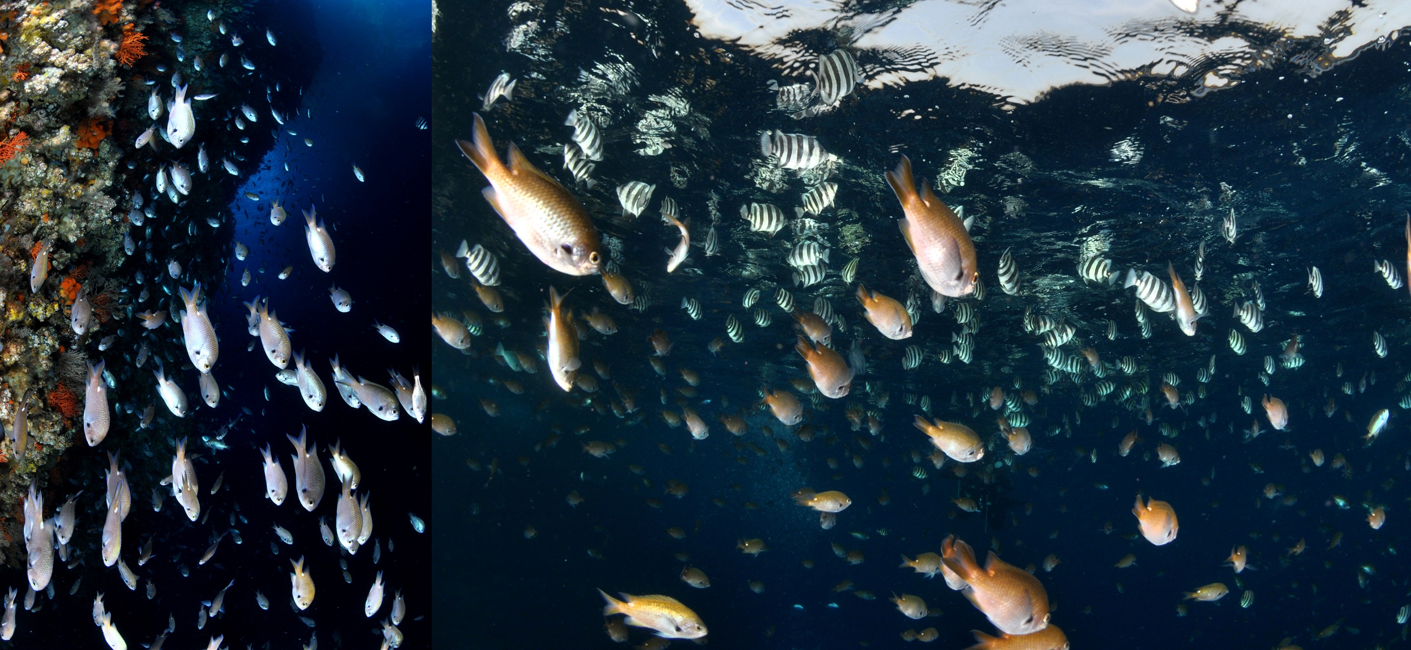수면까지 가득한 돌돔과 자리돔, 공암 아치 아래의 자리돔 군무