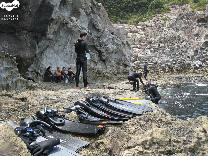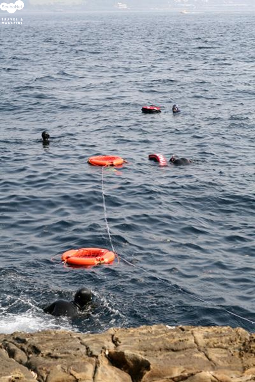 문섬 한계창에서 휴식중인 회원들과 프리다이빙 전용 장비들