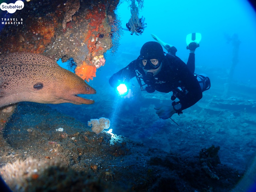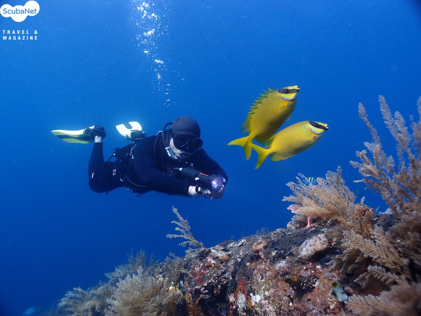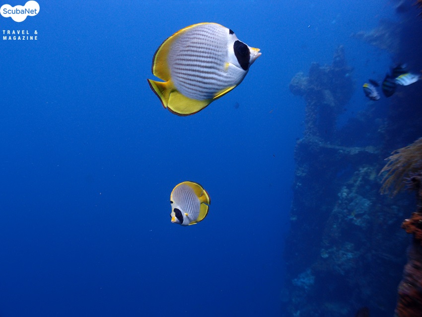 난파선 위의 레빗피쉬 한쌍과 다이버