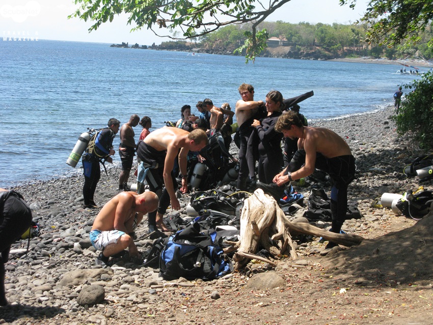 뚤람벤 해변에서 다이빙을 준비 중인 외국인 다이버들
