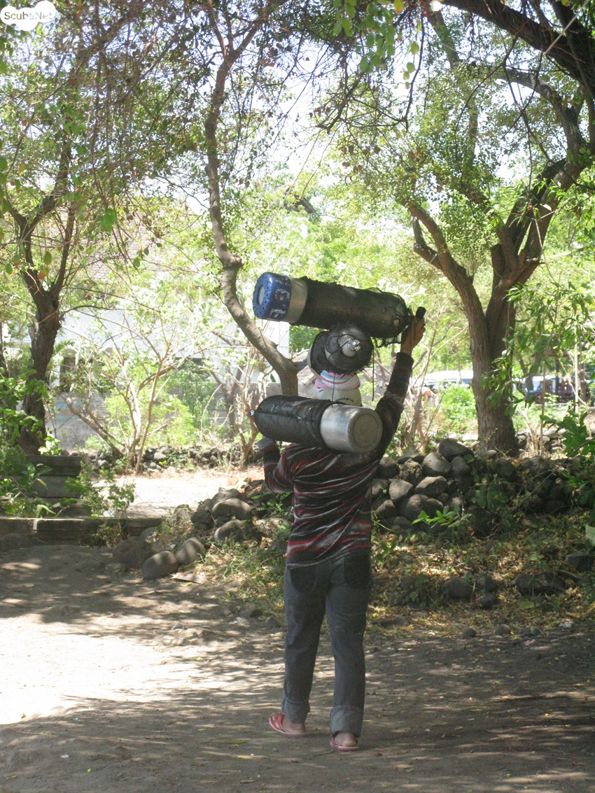 발리에서는 여인들이 다이버들을 위해 해변까지 탱크를 운반해 준다