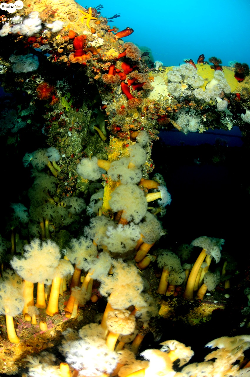 난파선에 붙어 있는 섬유세닐말미잘들이 널씬하게 뻗어 있는 모습
