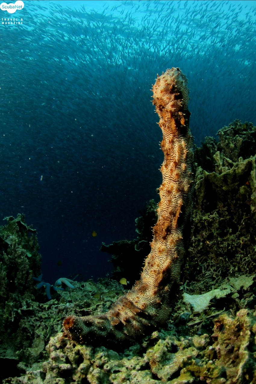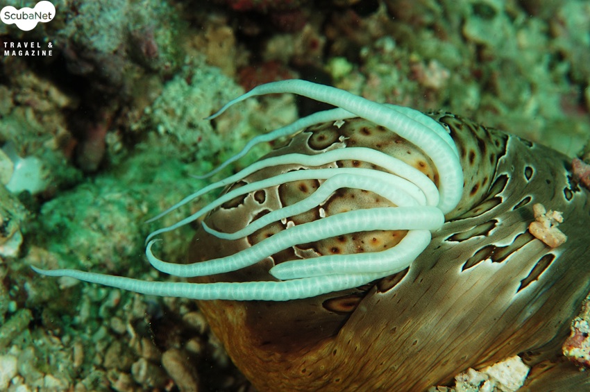 산란을 위해 몸을 곧추 세우고 있는 열대해삼 이마 근처에서 생식체를 내보낸다