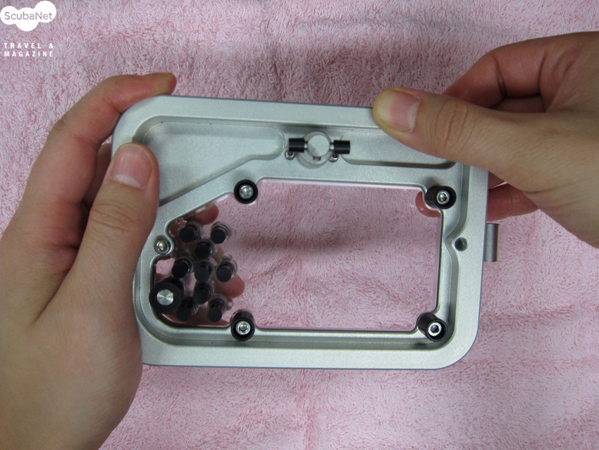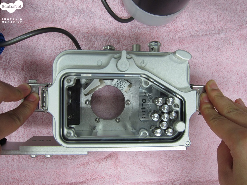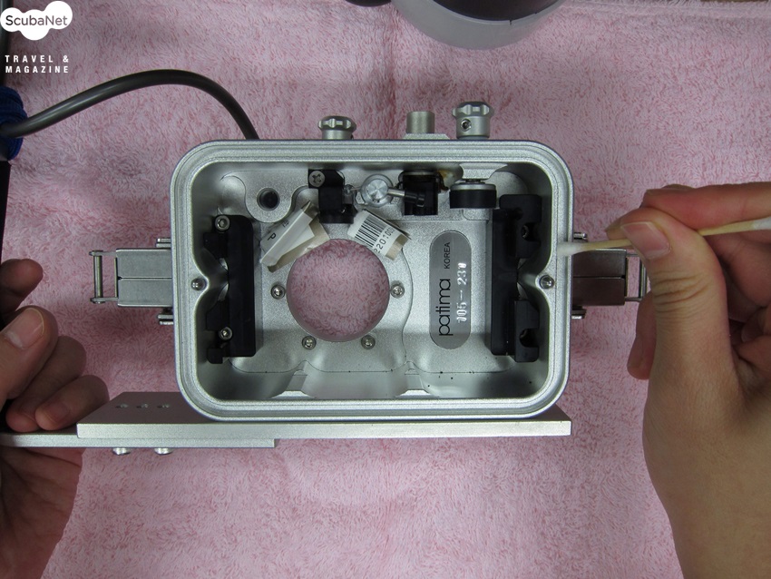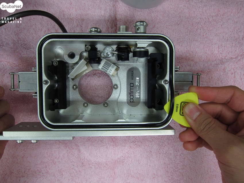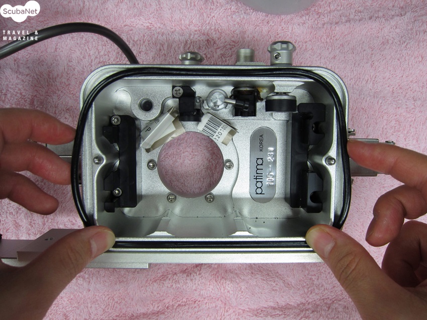 외장 스트로보가 있으면 배터리 부분의 마개와 케이블 단자에 있는 O-링도 같은 방법으로 처리하여 세팅을 합니다. O-링은 엄지와 검지 손가락으로 한 방향으로 밀어주면 쉽게 빼낼 수 있습니다.하우징이 준비가 되었으니 누수 테스트를 합니다. 카메라를 넣지 않은 빈 하우징을 민물수조에 넣어 누수가 되는 지를 확인합니다. 카메라를 세팅한 후에는 카메라가 제대로 작동되는 지를 확인을 합니다. 각 부분을 조작하는 버튼이 제대로 작동하는지를 꼼꼼히 체크하는 것이 좋습니다. 그리고 민물에 넣어 매번 누수확인을 하는 것을 잊지 마세요.