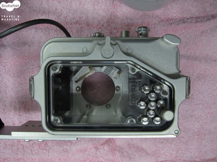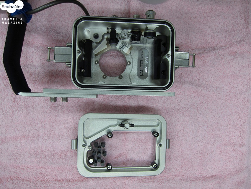 하우징의 재질은 PT 재질과 알루미늄 재질이 있지만, 지상과 수중의 온도 차이가 큰 국내 바다에 적합한 알루미늄 하우징을 모델로 이야기하겠습니다. PT 하우징은 수온이 차가우면 하우징 포트에 뿌옇게 서리가 맺히는 결로현상이 생겨 사진을 찍기 어려울 수 있으며, 열대바다에서도 내장 스트로보를 많이 터트리면 내부의 열이 올라가 같은 현상이 생기곤 합니다. 그래서 PT 하우징은 내부에 수분을 제거하기 위하여 실리카겔을 넣거나 서리제거제를 사용하여야 합니다. 알루미늄 하우징은 열을 잘 전달하기 때문에 하우징 내부와 외부의 온도차이가 크지 않아 결로현상이 잘생기지 않습니다.