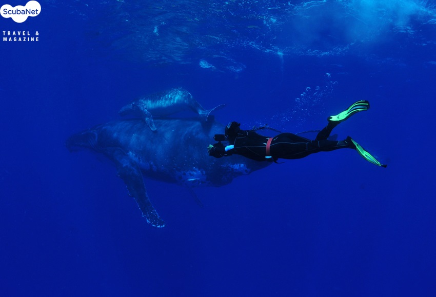 '최후의 바다, 태평양'에서 새끼를 돌보는 혹등고래를 스킨다이빙으로 쫓아가며 촬영하는김동식 감독 사진_주원