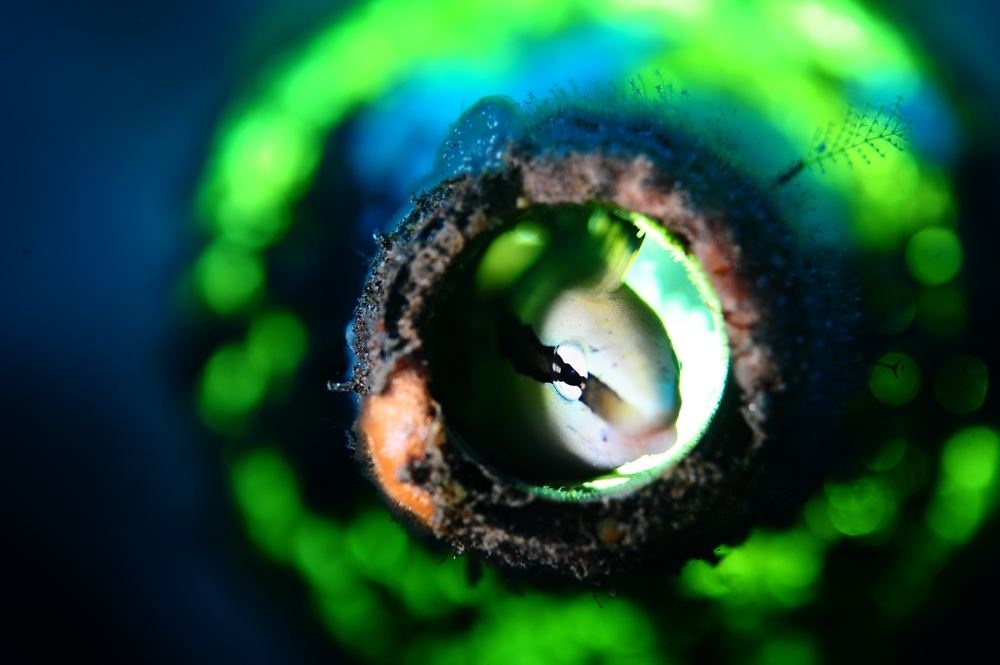 설명: 버려진 유리병에 살고 있는 팽블레니의 촬영을 위해 유리병 반대편에 Torch light를 조사하였고, 유리병색의 표현을 위해 조리개를 개방해서 촬영하였습니다. 다행이 고기가 호기심이 많아 즐거운 촬영을 할 수 있었습니다.