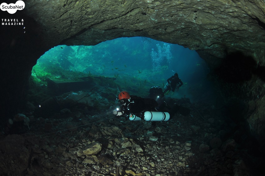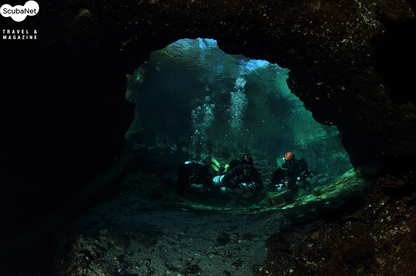 바닥의 녹색 조류를 지나 동굴로 들어가는다이버들