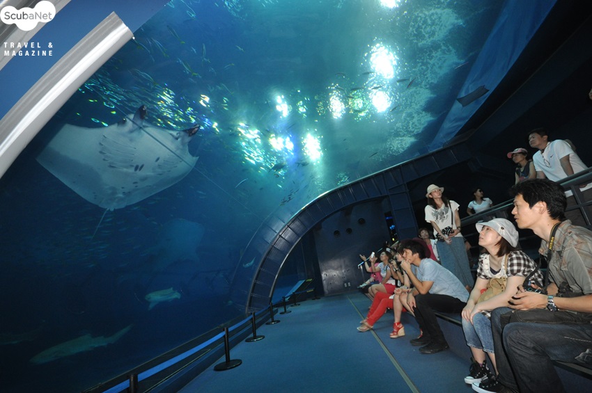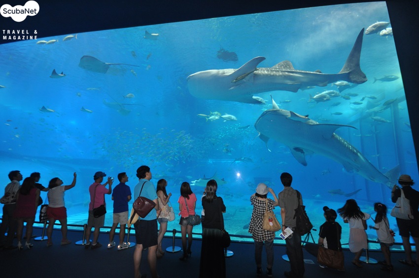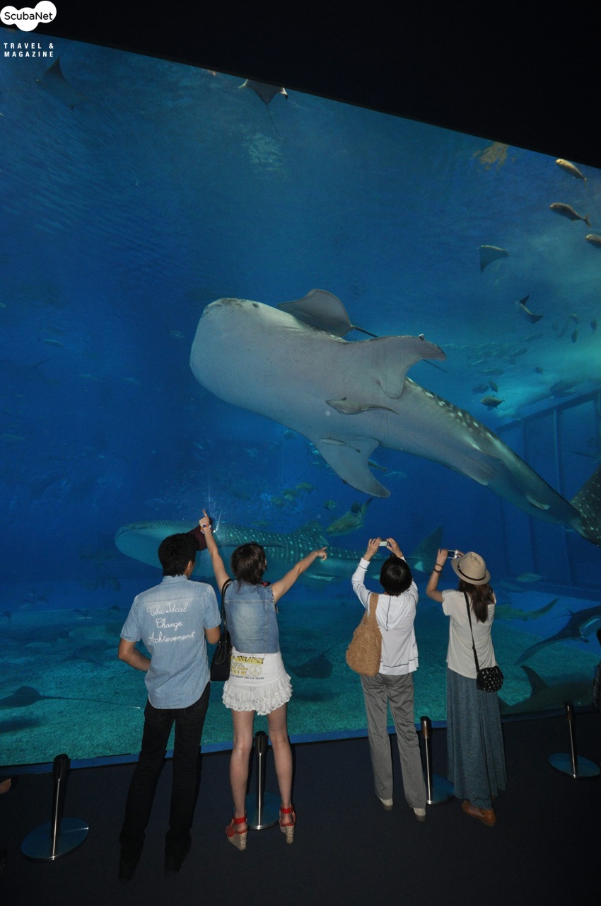 츄라우미 아쿠아리움오키나와를 찾는 스쿠버 다이버들이 육상 관광을 할 때 가장 선호하는 곳이 츄라우미 아쿠아리움이다. 츄라우미는 오키나와 말로 아름다운 바다라는 뜻이라고 한다. 고래상어와 만타 가오리 등의 대형 어류들을 구경할 수 있는 쿠로시오 관은 관람객들의 시선을 사로잡았다. 관람객들이 있는 곳은 어둡게 조명을 줄여서 아쿠아리움의 대형 창이 마치 영화관의 스크린 같은 분위기로 해양생물의 생생한 모습들을 보여준다. 어린 고래상어가 3마리가 있었고, 만타 가오리도 여러 마리 있었다. 레오파드 상어, 마블레이, 스팅레이, 참치 등 회유성 어류들이 넓은 수조를 돌아서 창 가까이로 다가오는 모습은 장관이 따로 없다.