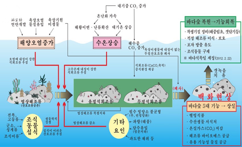 국내의 연안에서 “백화현상”이 처음 발견된 것은 1970년대 말이었는데, 이후 발생 빈도가 높아지다가 1990년대 말에는 경상북도영덕군과 포항영일만 일대의 동해안으로까지 확산되었으며, 현재에는 동해와 남해 및 제주도를 포함한 남해안의 부속도서 등에서 백화현상이 관찰되고 있는 실정이다. 백화현상으로 인하여 연안의 갯바위에는 분홍색과 흰색을 띤 다양한 무늬의 흰색 물질이 달라붙어 연안 생태계의 1차생사자인 해조류가 점차 소실되고 해중림(海中林)이 사라져, 생산자로서의 기능이 마비되고 있으며, 해조류를 먹이로 하는 소라, 전복, 성게류 등 각종 어패류가 죽음에 이르게 되어 해양 생태계 내 먹이사슬의 균형은 무너져 해양의 황폐화가 가속화되고 있다. 일부 전문가들은 이 현상이 자연계에서 일어날 수 있는 자연스럽고 당연한 현상이기 때문에 인위적으로 억제하는 것은 매우 어렵다는 입장을 취하고 있으나, 정부에서는 “바다 숲 가꾸기 사업”, “해중림 조성 사업” 등 막대한 재원을 투자하여 어획고 및 수산생물 생산량의 감소로 인한 어민들의 어려움과 자원회복 그리고 백화현상의 해결방안을 찾고자 동분서주하고 있다.