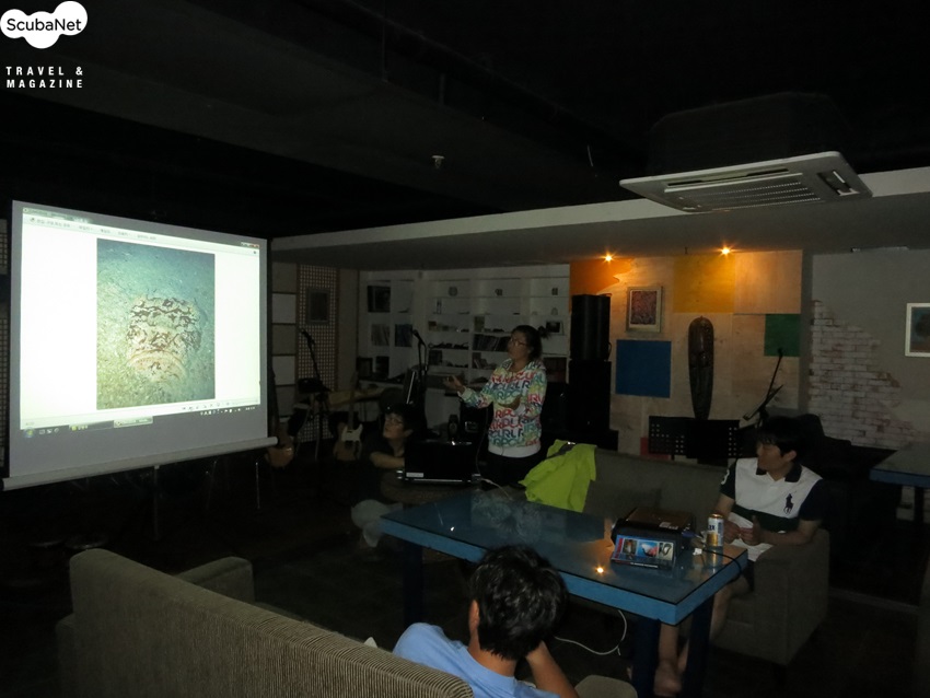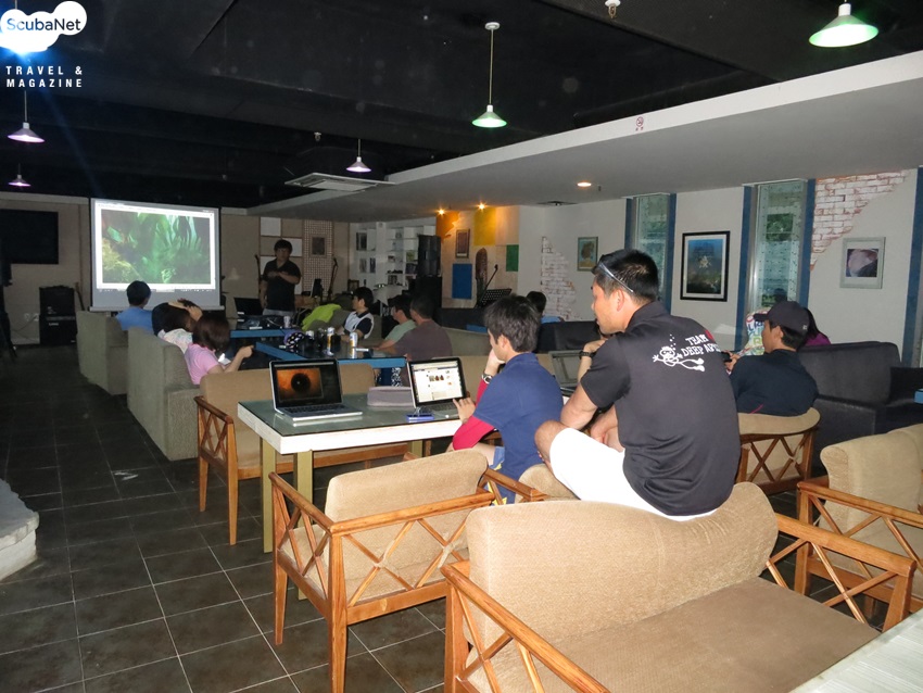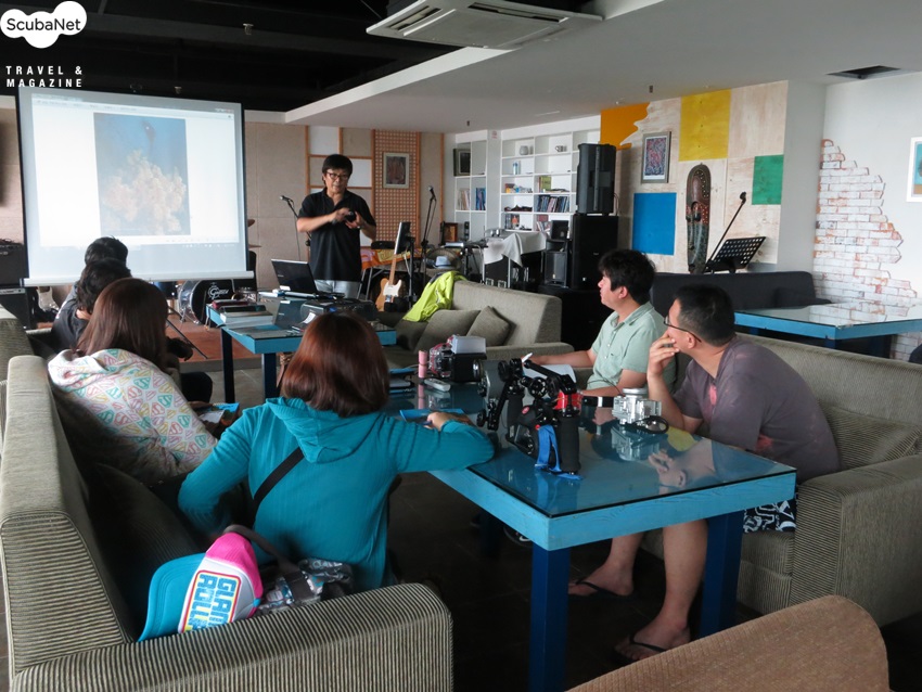 다이빙을 마치고 사진 5장씩을 골라 디브리핑을 진행했다. 언제나처럼 정상근 교수님의 사진에 대한 꼼꼼한 맞춤형 조언이 이어졌다. 이번에는 특별히 콤팩트 카메라 분야에서 두드러진 실력을 보이며 여러 대회에서 상을 휩쓸고 있는 이종순, 강현주 부부 다이버가 자신들의 사진을 소개하는 시간을 가졌다. 콤팩트 카메라로 표현할 수 있는 최상의 기량을 담은 사진들에 참가자들의 감탄이 끊이질 않았다. 이들 부부의 사진은 많은 초보 사진가들에게 새로운 도전이 되었다.