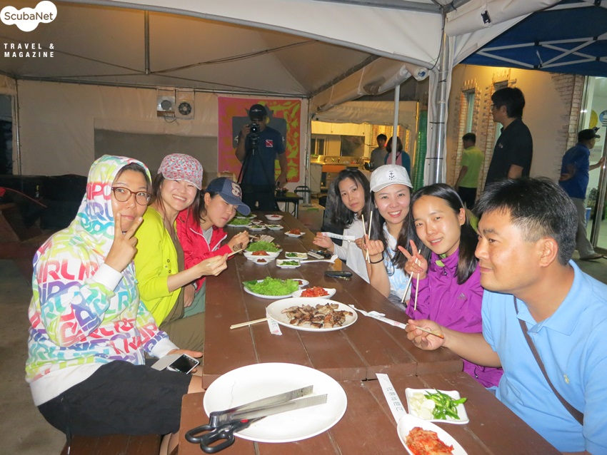 저녁시간에는 함께 바비큐를 즐기며 그동안의 회포를 풀었다. 38마린 리조트에서는 1인당 2만원에 바비큐를 편안히 즐길 수 있다. 소시지와 가리비, 그리고 무제한으로 제공되는 삼겹살로 고픈 배를 채우며 또 술잔을 채우며 밤이 깊도록 다이버들의 수다는 끝이 날 줄을 몰랐다.