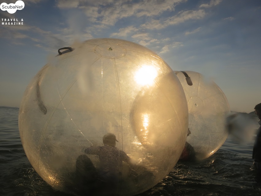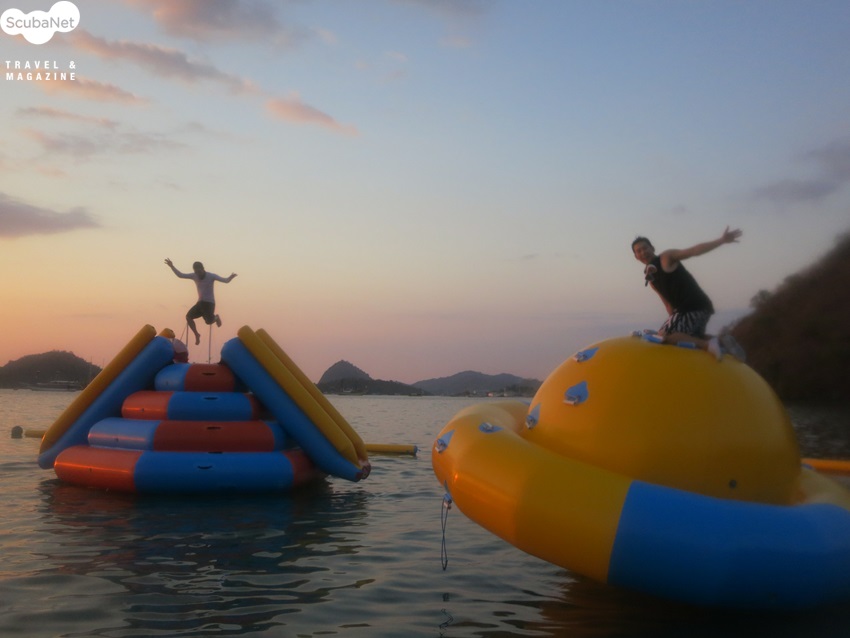 La Prima 호텔 앞에 작은 워터파크가 있다. 워터파크라고 해서 거창한 것을 기대하진 마시라. 여기는 인도네시아에서도 외진 곳, 라부안바조이니까. 물 위에 놀이기구를 몇 개 띄워놓은 작은 놀이터라고 생각하면 적당하다. 하지만 즐거운 다이빙으로 업되어 있는 다이버들끼리 수중촬영용 카메라까지 들고 있다면 케리비안베이 부럽지 않게 재밌게 놀 수 있다. 시소, 미끄럼틀, 트렘블린 등이 물에 띄워져 있는데 물때에 따라 발이 바닥에 닿을 수도 있고 닿지 않을 수도 있다. 전자는 조금 더 편히 놀 수 있고 후자는 조금 더 필사적으로 놀게 된다.