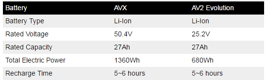 230Wh의 NiMh 배터리를 사용하지만 아폴로의 AVII이볼루션은 680WH의 Li-ion 배터리를 사용한다.