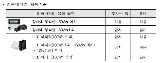 개인용도의 휴대용 전자기기에 한하며 용량은 160Wh 이내로 제한