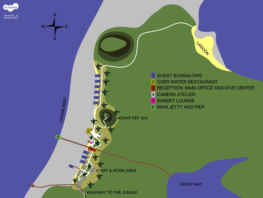 리조트의 배치도리조트는 토요일에 체크인하여 6일 숙박하고, 금요일 오후 리조트를 출발해 소롱에서 일박하고, 토요일 소롱 공항을 출발하는 스케줄로 일주 단위로 프로그램을 운영하고 있다. 최소 일주일 동안 같은 멤버끼리 다이빙하고, 식사하며 이야기 하게 되어서 Arrive as a guest, feel like a king, leave as a friend 라는 리조트의 홍보 문구가 그냥 하는 말이 아님을 느끼고 가게 된다.