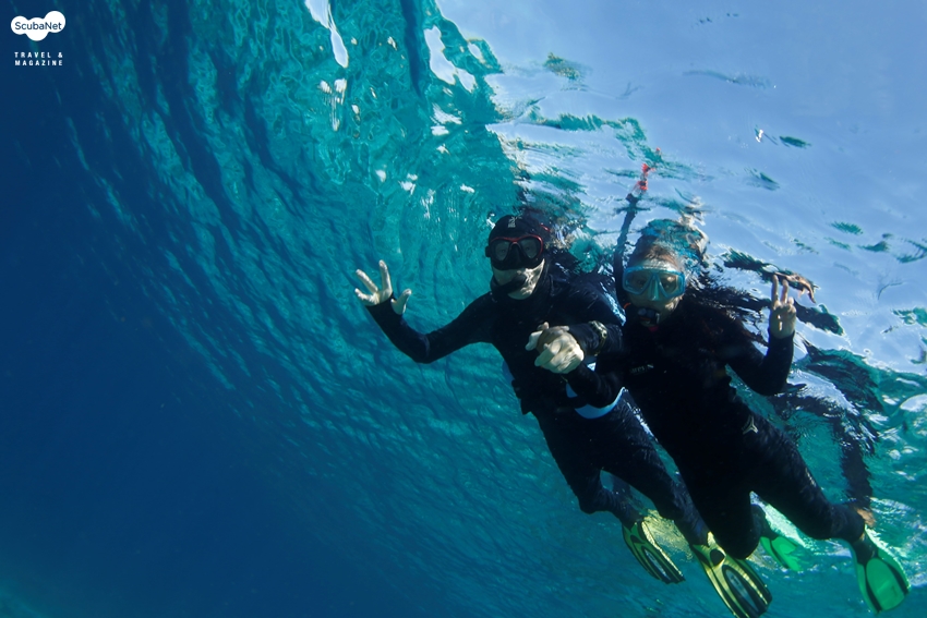 87세 아버님이 가이드의 안내를 받아 스노클링을 즐기시고 계시다.