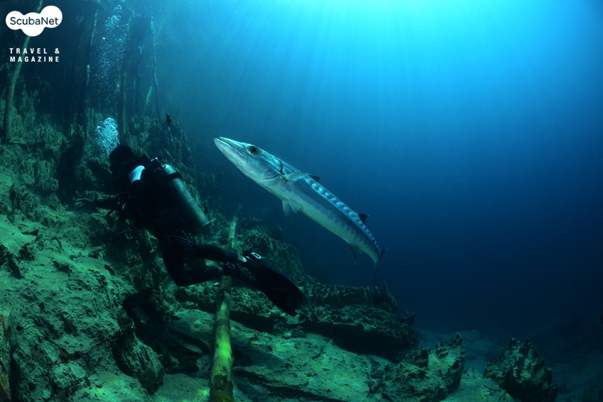 바라쿠다 레이크란 이름이 호수에 바라쿠다가 살기 때문에 붙었다고 하는데 지난 번 방문에서 보지 못했기 때문에 바라쿠다의 존재를 부정하고 있었다. 하지만 이번 다이빙에서 마지막 출수 직전에 Great Barracuda를 만날 수 있었다. 호수의 주인다운 늠름한 자태에 반해 셔터를 정신 없이 눌렀던 것 같다.
