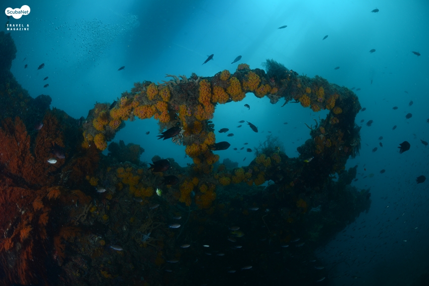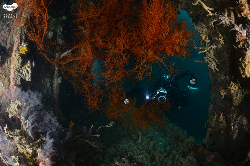 모라잔 마루의 선체에 부착한 고르고니안 산호와 레빗피쉬들. 모델/박건욱두 번째 다이빙으로 진행된 곳이었는데 길이 91.5m의 보조 수송선으로 최대 수심이 25m에 우현 쪽으로 뉘어져 있다. 선체의 상단이 12m 정도로 얕은 편이다. 선창을 통해 들어가니 꼬치고기 종류가 엄청나게 무리를 이루고 있었다. 2개의 커다란 보일러와 1960년대에 엔진을 인양해서 비어있는 엔진룸 등이 있었다.