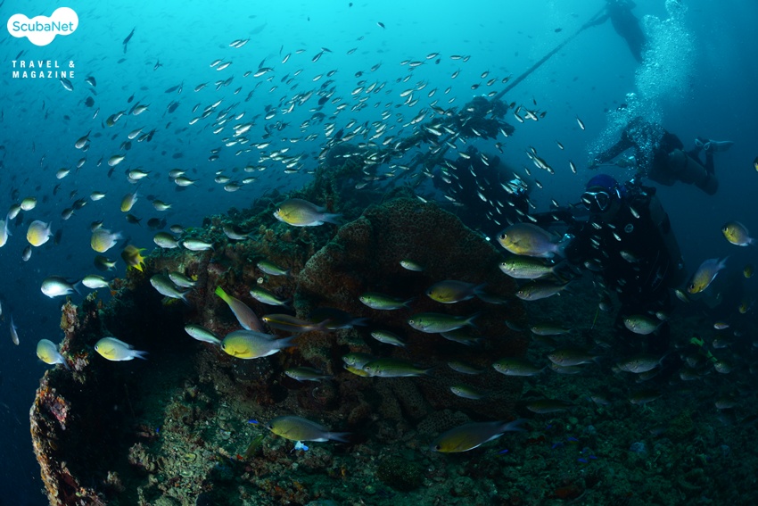 작지만 배 내부로 들어가니 글라스피쉬 무리와 멸치를 닮은 작은 꼬치고기들이 엄청난 무리를 이루고 있어서 사진 촬영하기에 좋았다. 외부로도 글라스피쉬와 제비활치들이 돌아다니고 있었는데 초보자 다이버들도 안전하고, 재미있게 난파선 다이빙을 즐길 수 있는 곳이었다.