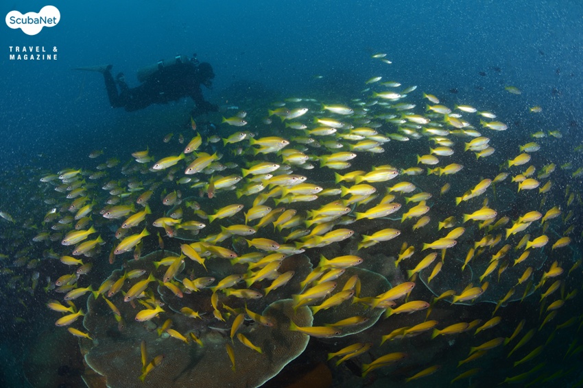 오키카와마루 선수 쪽에서 밀려오는 강한 조류를 받으며 자리돔과 어류들이 군무를 벌이고 있는 모습.필리핀의 새로운 대세, 코론