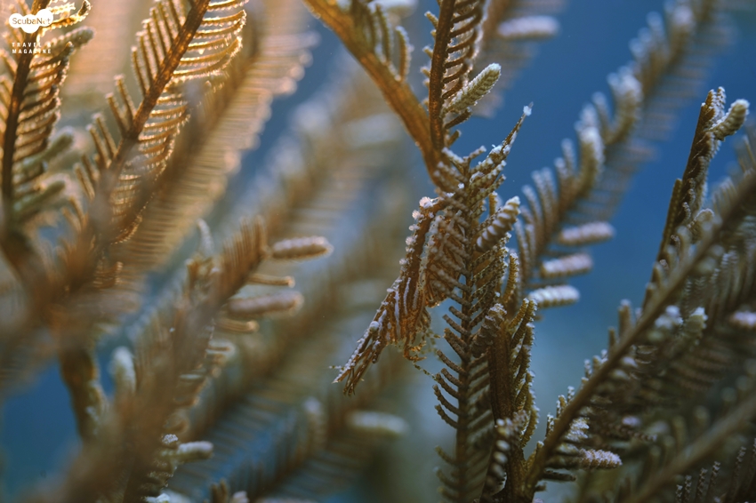 여기서 관찰 되는 공생 새우는 대부분 폴립에 가려서 잘 보이지 않는데 위 사진처럼 폴립이 살아있는 상태로 숨어 있는 공생 새우를 촬영하여야 한다.마크로 촬영의 경험이 많은 촬영가들은 대략 어떤 피사체가 어디에 서식하는지 익숙해져 있을 것이지만 그렇지 않은 경우는 사전에 미리 정보를 입수하는 것이 좋을 것이다. 어떤 생물이 어디에 은폐하고 있는지 이런 것은 미리 알아 두는 것이 좋으며 또 그 지역에 주로 발견되는 재미있는 피사체는 무엇이 있는지도 사전에 인지하면 많은 도움이 될 것이다. 마크로 촬영의 과정 중 피사체를 찾는 것은 중요한 부분 중 하나이며 무엇 보다 먼저 생각해야 하는 것은 생태적 자연스러움의 표현이다. 많은 가이드들이 피사체의 전체를 뚜렷하게 보여주기 위해 은폐된 것으로부터 꺼내거나 건드려서 위로 올리거나 하는 경우가 있는데 수중 사진의 가치를 떨어트리는 행위일 것이다. 서식처의 환경과 비슷하게 위장을 하고 있는 피사체를 찾을 때는 사실 눈에 잘 띄지 않아서 어렵다. 이때 피사체를 찾기 위해 가장 먼저 해야 할 것은 피사체의 눈을 찾는 것이다. 대부분의 경우 서식처의 패턴과 차이를 보이는 피사체의 부위는 눈인 경우가 많으므로 가장 주의 깊게 찾아야 할 부분이다.