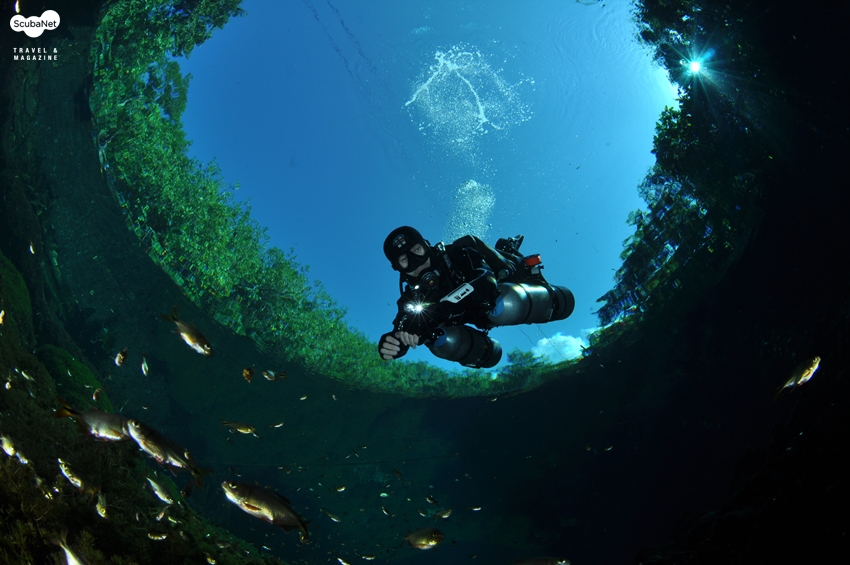수련과 물풀들이 가득했고, 열대 담수어들의 모습도 보였다. 버블체크, S드릴 등의 기본 스킬 체크를 마치고 프라이머리 릴을 풀어가며 캐번지역에서 캐이브지역으로 들어갔다. 캐이브 다이빙 교육을 받지 않았다면 들어가지 말라는 스탑(STOP) 사진을