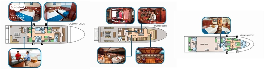M/V Galapagos Sky는 길이 33m에 폭 7.3m로 갈라파고스 어그레스와는 길이는 같은데 폭이 2피트 정도 넓다. 그만큼 내부 공간이 넓어졌다는 느낌이 든다. 선데크를 제외하고 3개의 데크가 있는데 각 데크의 구조는 다음과