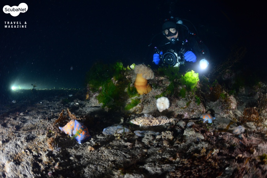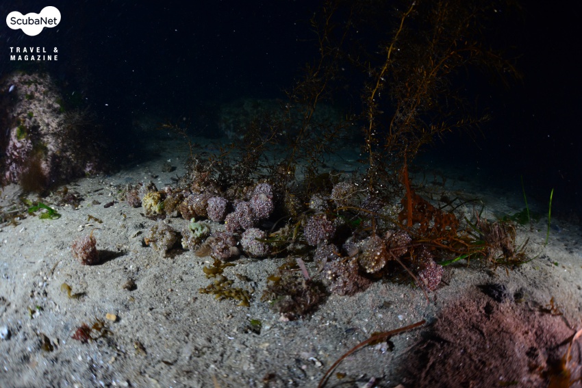 8시가 넘어서 진행된 야간 다이빙에서는 렌즈를 갈아서 60mm 마크로렌즈로 세팅했다. 먼저 모자반과 바위에 붙어 있는 도루묵의