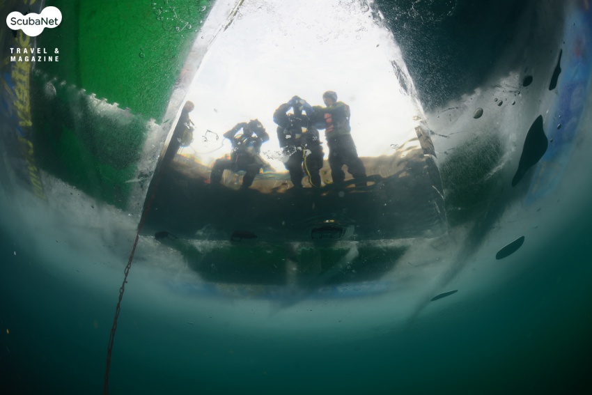 얼음 밑에서 바라 본 다이빙을 준비하는 다이버들